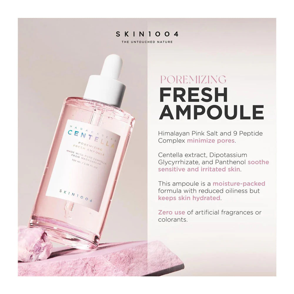 The SKIN1004 Madagascar Centella Poremizing Fresh Ampoule is a lightweight, non-sticky serum designed to minimize enlarged pores and balance oily or combination skin. Formulated with 92% Centella Asiatica extract, it soothes and repairs the skin barrier while enhancing elasticity. Enriched with Pink Himalayan Salt, the ampoule clears impurities and refines skin texture. A 9-peptide complex promotes collagen synthesis, tightening sagging pores and improving skin elasticity. Its hydrating formula, free from parabens, alcohol, and artificial fragrances, provides a refreshing finish suitable for daily use.clinikally.com+1themakeupplanet.com.pk+1caretobeauty.com+2skin1004.com+2basharacare.com+2